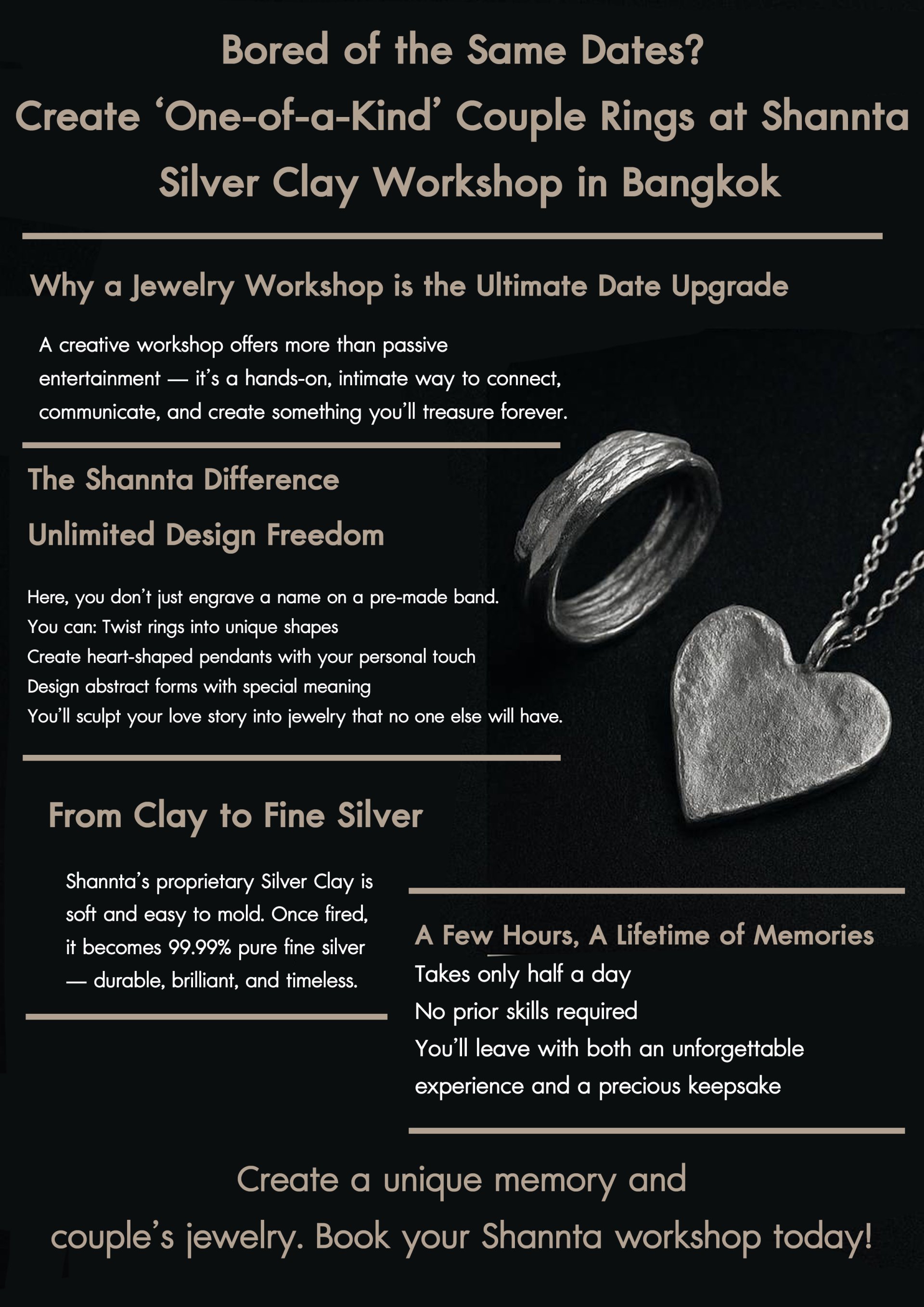 Movie nights, shopping, dinner the usual dates can start to feel routine. If you're looking for unique couple activities in Bangkok that are meaningful and memorable, spend a few hours at Shannta Silver Clay Workshop and design your own 99.99% fine silver jewelry from scratch.